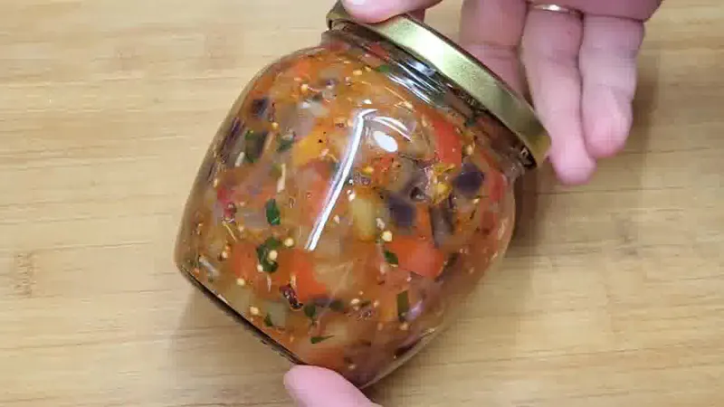 - Смесь овощей и специй расфасовываем в баночки и плотно закрываем. На дно казана укладываем полотенце, устанавливаем баночки и заливаем воду. Закрываем крышку и стерилизуем в течение 15 минут.