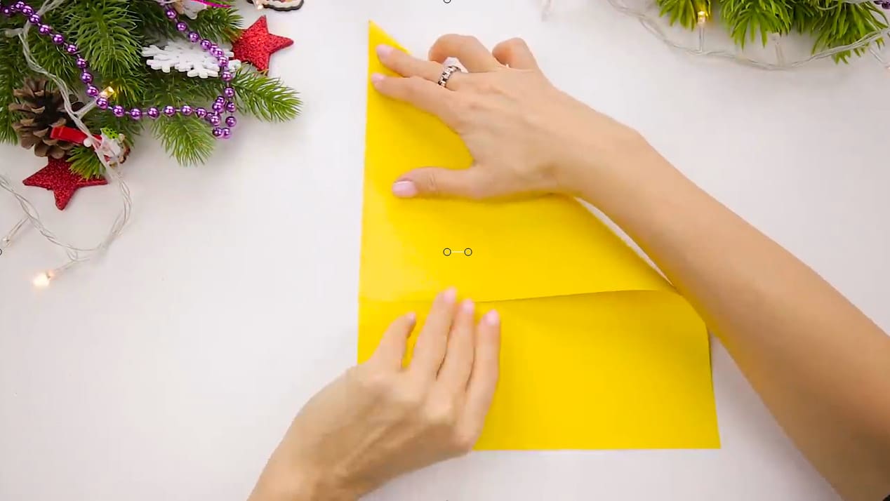 Первые шаги будут такими же, как в случае с Дедом Морозом выше. Обычный лист формата А4 складываем пополам. Проводим пальцем по получившемуся изгибу, чтобы придать ему более четкие очертания. Также можно разложить лист, затем сложить его уже с другой стороны и провести по изгибу снова. Теперь по четкому изгибу можно резать.