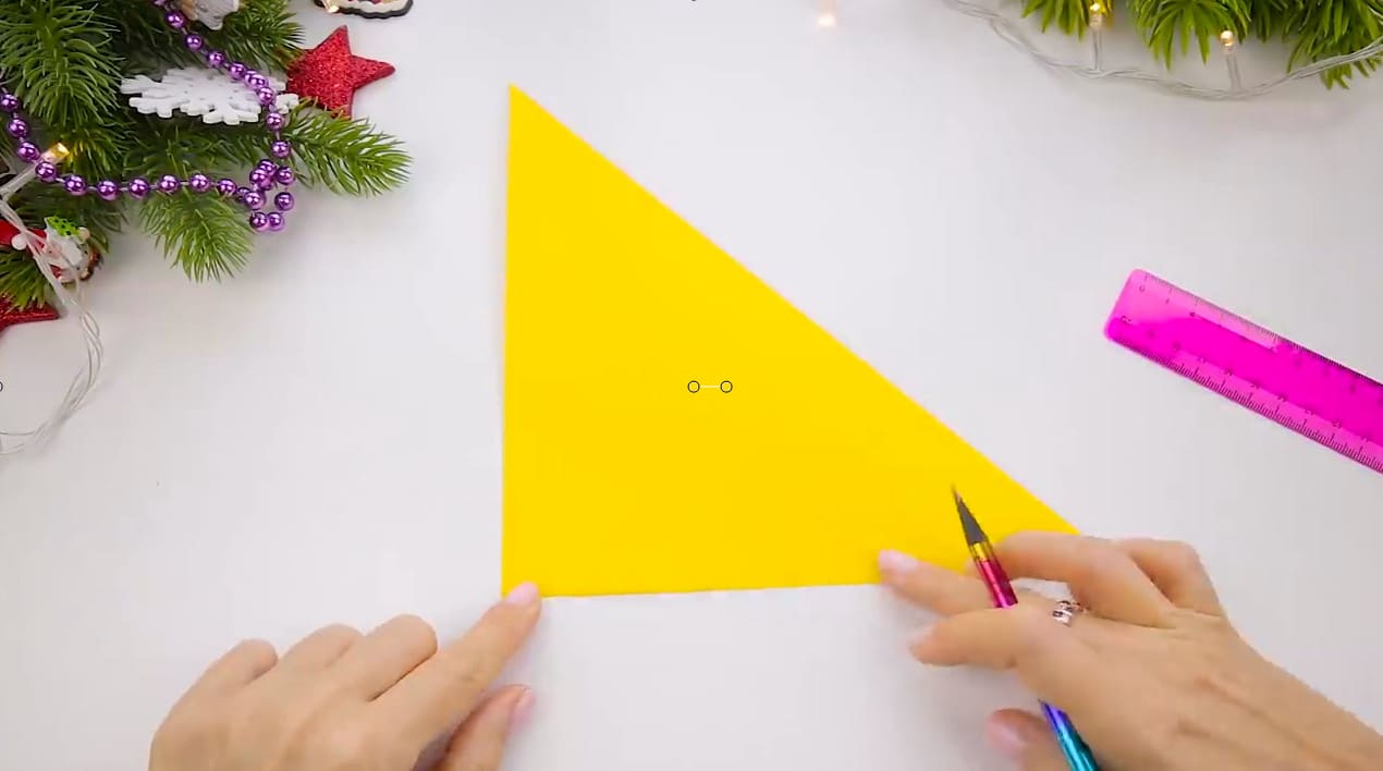 Другой треугольник мы подрежем так, чтобы у нас осталась от него только полоска по центру. Финальный штрих мы проделаем с оставшимся треугольником. В центре вырезаем небольшой треугольник, затем по бокам также вырезаем эту фигуру. У нас должен получится колокольчик с ленточками.