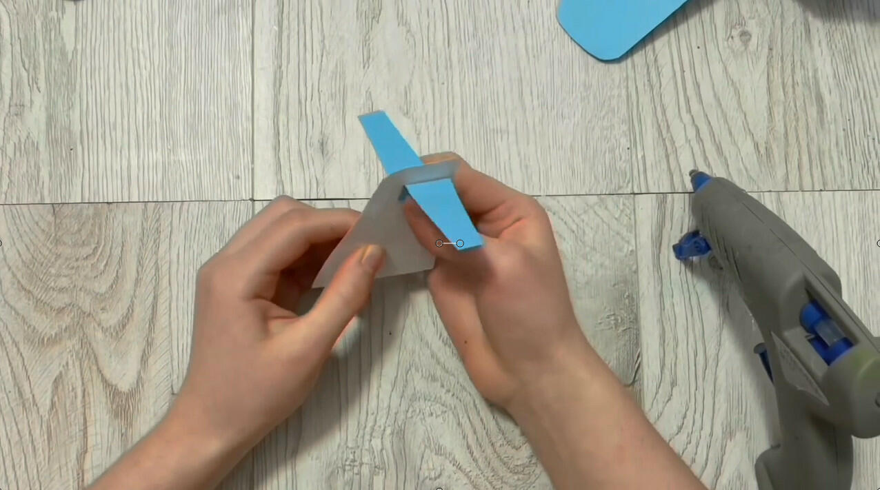 Еще мне нужно вырезать два прямоугольника из голубого картона, которые потом свернуть и зафиксировать в форме трубочки. Так будут выглядеть будущие шасси.