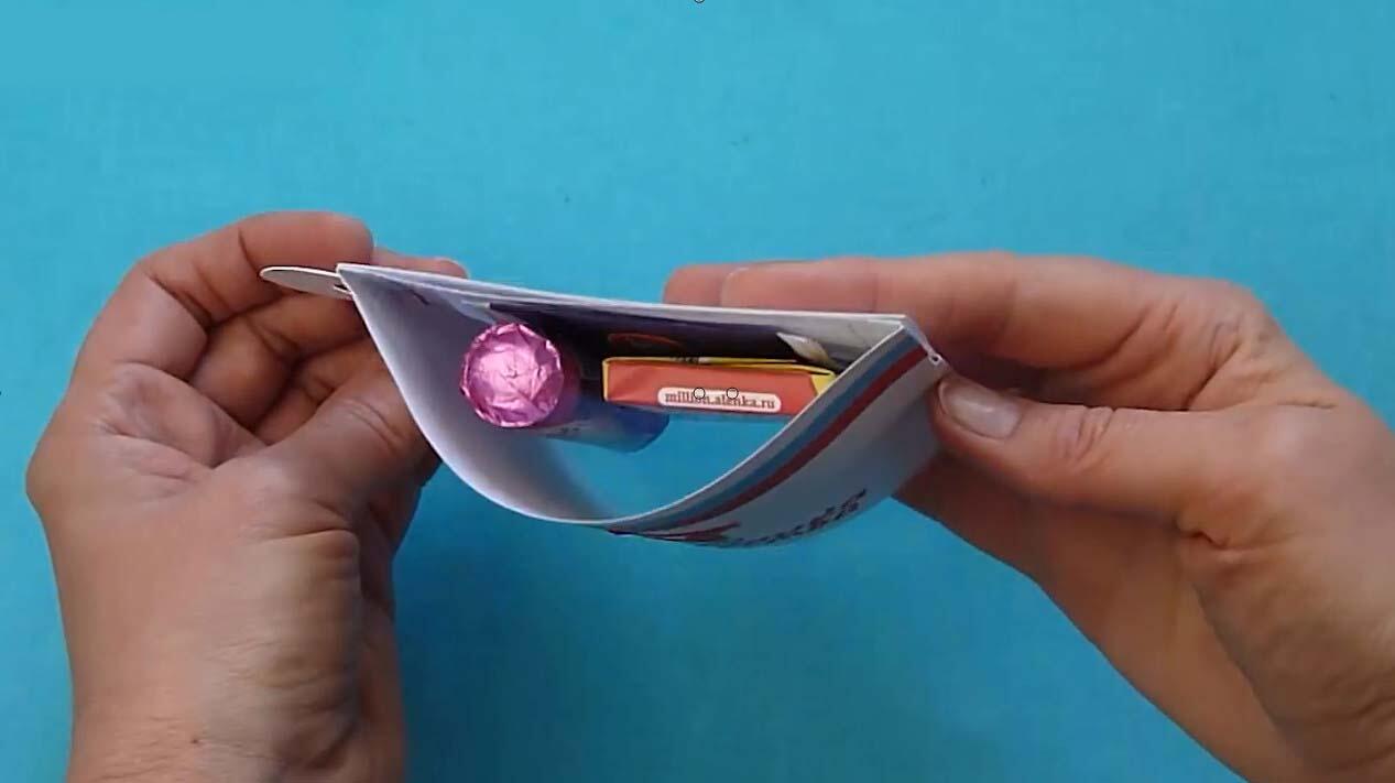 В качестве сюрприза можно выбрать что угодно – маленькую шоколадку, конфету, небольшой батончик, пакетик чая или кофе. Главное условие – они должны помещаться в пределы нарисованной рамочки.