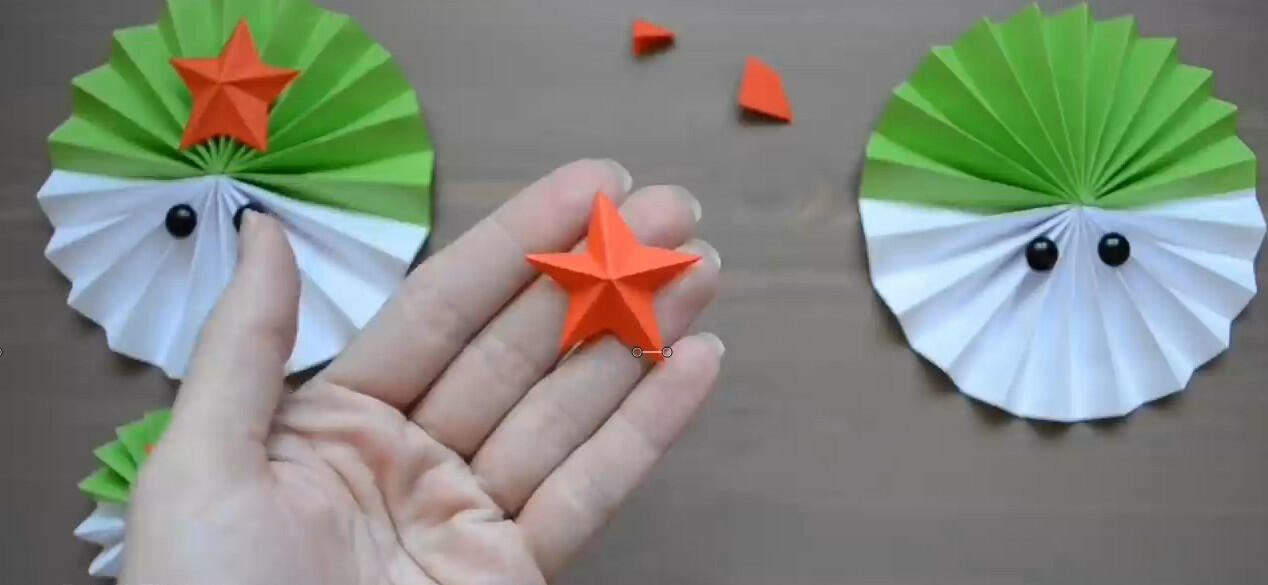 Для украшения использую декоративные глазки и носик (если их нет, то можно вырезать из цветной бумаги). Из красной бумаги вырезаю звездочку, которую прикрепляю на зеленую часть круга. Под носиком приклеиваю усы – бравый солдат готов.